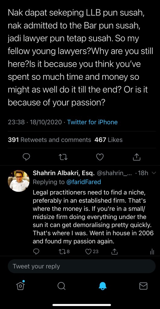 For those not conversant in Bahasa Malaysia, the tweet literally translates to, “It’s difficult getting a law degree, to get admitted to the Bar and being a lawyer…” and it continues in English. Asking the position of fellow young lawyers and considering the possibility that young lawyers may be in the profession having no other choice and due to their passion or the investment they made in obtaining a law degree.