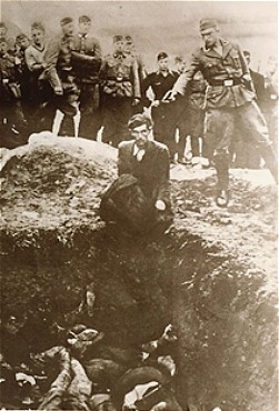 A member of the Einsatzgruppen shoots a Jew. Note the mass grave. Credit: http://law2.umkc.edu/faculty/projects/ftrials/nuremberg